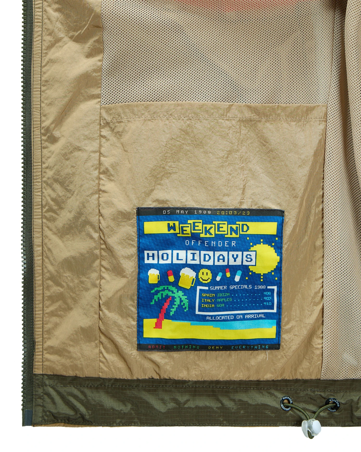 WO windbreaker jacket made from a mixed fabrication of a lightweight high density Nylon parachute style fabric and our newly developed SRS 1K fabric. This fabric has a lightweight shimmering quality as well as a tear resistant crosshatch effect. Both fabrics are treated with an additional DWR (Durable Water Repellent) coating.