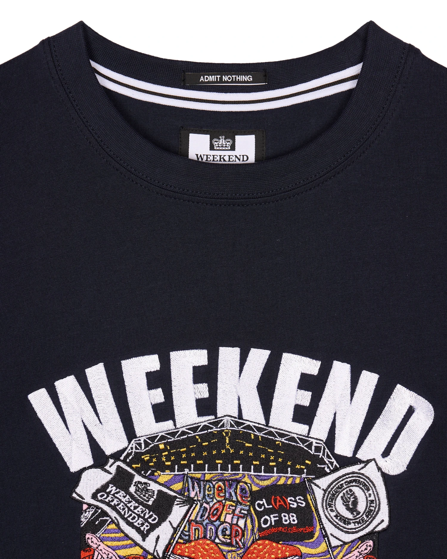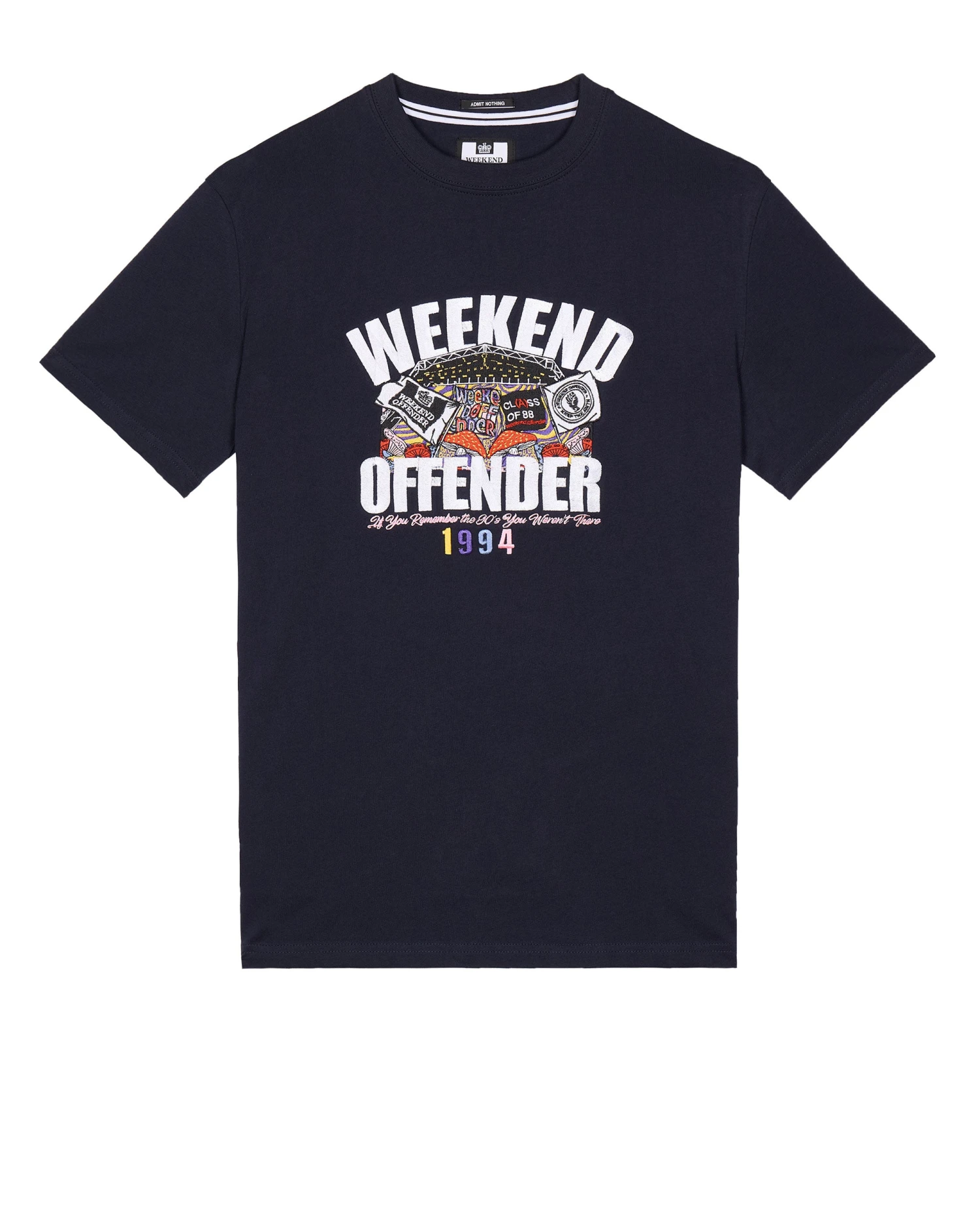 Graphic tee featuring a large front chest embroidery design of the Pyramid stage at the Glastonbury festival, featuring a crowd full of weekend offender flags.