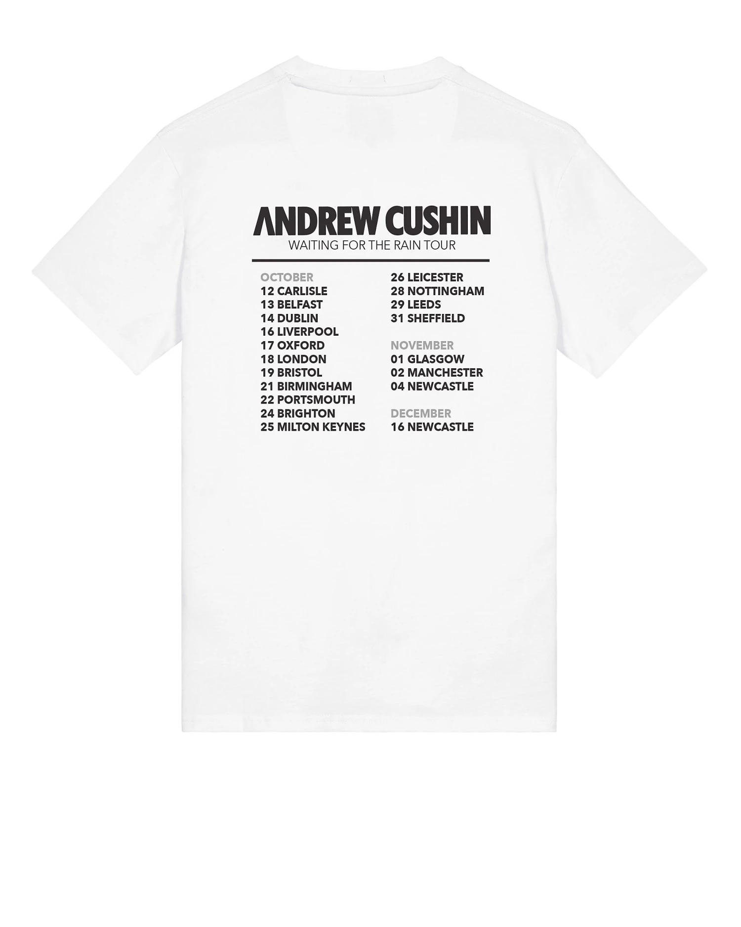 NEW. A graphic t-shirt to celebrate the success of Andrew Cushin’s UK tour, which runs until early December, produced in limited numbers. Get them while you can.